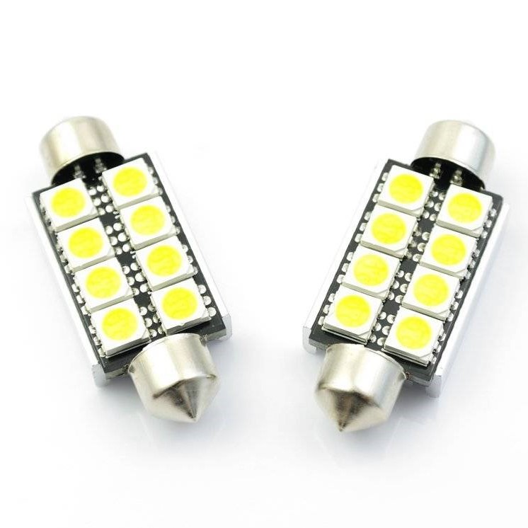 Náhradní LED žárovka s paticí sufit (41mm), bílá, s vestavěným rezistorem ( nehlásí závady řídící jednotky na žárovce u nových vozidel), 8x vysocesvítivé čipové SMD LED diody, napájecí napětí 12V, vhodné např do osvětlení SPZ nebo vnitřních lapiček. Nehlásí závady řídící jednotky na žárovce u nových vozidel se systémem kontroly praské žárovky. Např. u VW, Audi, Škoda, Seat, BMW, Volvo, Mercedes, Porsche, Mini. Vynikající do vozidel, kde dochází k častému praskání klasických žárovek, pro všechny osobní vozy, dodávky a motocykly s palubním napětím 12V.
