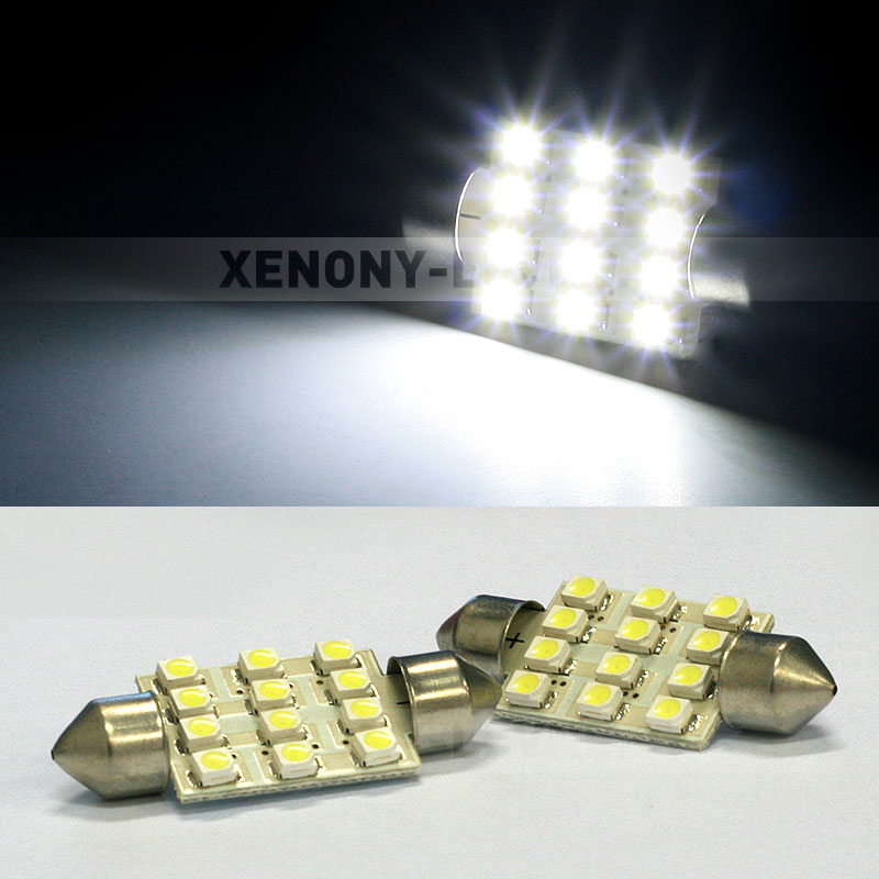 Náhradní LED žárovka s paticí sufit (36mm), bílá, 12x vysocesvítivé čipové SMD LED diody, napájecí napětí 12V, vhodné např do osvětlení SPZ nebo vnitřních lampiček. Vynikající do vozidel, kde dochází k častému praskání klasických žárovek, pro všechny osobní vozy, dodávky a motocykly s palubním napětím 12V.